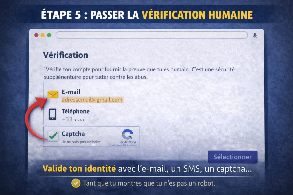 Captcha, code envoyé par e-mail ou SMS.